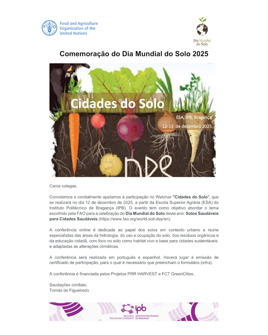 Online /PresencialO evento assinala o Dia Mundial do Solo com o webinar “Cidades do Solo” e visita técnica a um projeto de horticultura urbana junto ao rio Fervença.